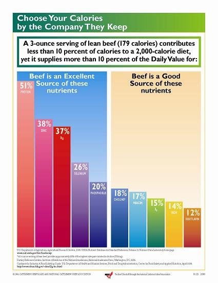 A substantial body of evidence shows the nutrients in red meat, such as protein, iron, and B-vitamins, help maintain a healthy weight, build muscle and fuel physical activity – all of which play an important role in a healthful lifestyle and disease prevention. We do know that many people are overfed, yet undernourished, so it’s increasingly important for people to follow the 2010 Dietary Guidelines to “get more nutrition from their calories,” and eat a variety of nutrient-rich foods within and among all food groups. In fact, a three-ounce portion of lean beef is only 179 calories on average.